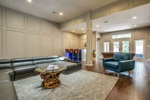THE SPACE: Designed for entertaining, the HUGE open floor plan is ideal for large groups. Plenty of seating with massive leather sectional, 65` 4K television and high-speed internet. The bar is equipped with an ice-maker, wine fridge and Bluetooth speaker. You can mingle around the bar, play Billiards, or enjoy outdoor activities like Ping Pong and corn hole.
